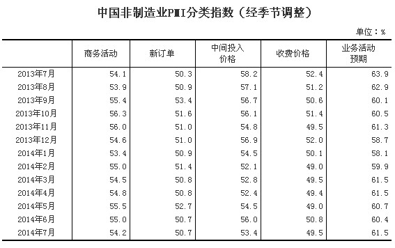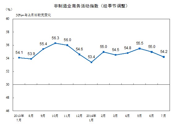 2014年7月,中國非制造業(yè)商務活動指數為54.2%,雖比上月回落0.8個百分點,但仍高于榮枯線4.2個百分點。