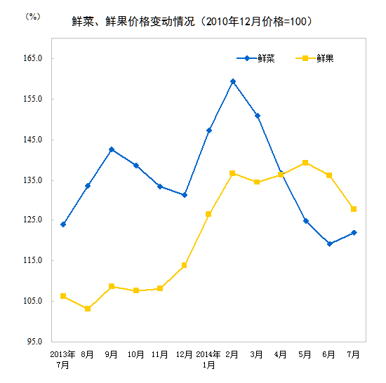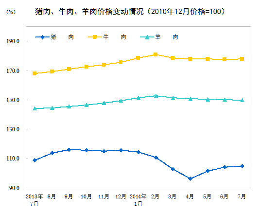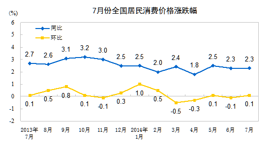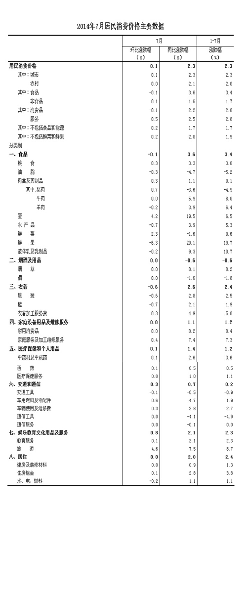 2014年7月份,全國居民消費(fèi)價(jià)格總水平同比上漲2.3%。其中,城市上漲2.3%,農(nóng)村上漲2.1%;食品價(jià)格上漲3.6%,非食品價(jià)格上漲1.6%;消費(fèi)品價(jià)格上漲2.2%,服務(wù)價(jià)格上漲2.5%。1-7月平均,全國居民消費(fèi)價(jià)格總水平比去年同期上漲2.3%。