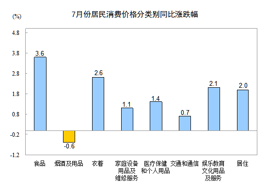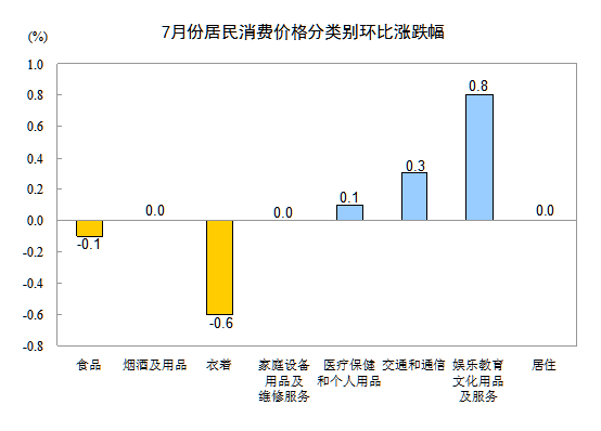 7月份,非食品價(jià)格環(huán)比上漲0.1%。其中,娛樂教育文化用品及服務(wù)、交通和通信、醫(yī)療保健和個(gè)人用品價(jià)格分別上漲0.8%、0.3%和0.1%;煙酒及用品、家庭設(shè)備用品及維修服務(wù)、居住價(jià)格均持平;衣著價(jià)格下降0.6%。