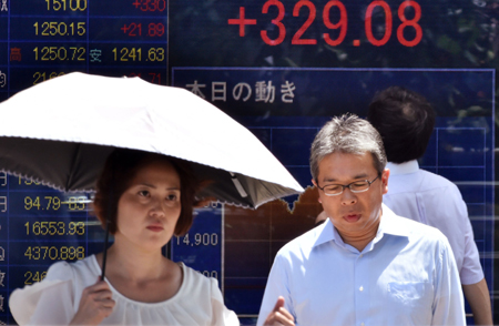 因伊拉克和烏克蘭等地緣政治緊張局勢有所緩和,加之市場認(rèn)為美軍對(duì)伊拉克的軍事行動(dòng)將是有限的,繼上周五紐約股市三大股指全線收高后,11日,亞太股市多數(shù)上漲。其中,日本東京股市錄得四個(gè)月以來最大單日漲幅,日經(jīng)股指上漲352.15點(diǎn),收于15130.52點(diǎn),漲幅為2.38%。印度尼西亞、菲律賓、中國香港等多個(gè)地區(qū)股市主要股指漲幅也超過1%。 圖為行人11日走過日本東京一塊股票價(jià)格顯示屏前。