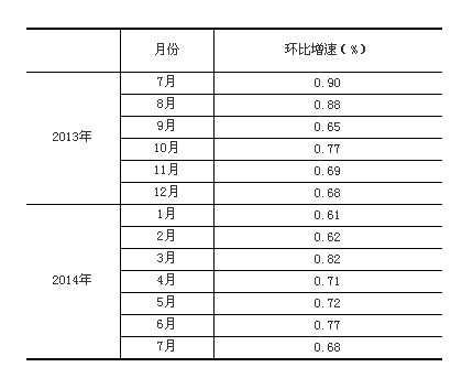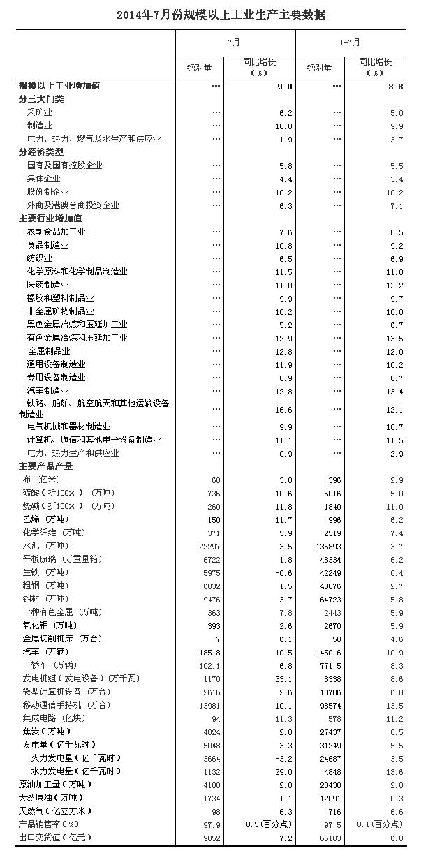 2014年7月份,規(guī)模以上工業(yè)增加值同比實(shí)際增長9.0%(以下增加值增速均為扣除價格因素的實(shí)際增長率),比6月份回落0.2個百分點(diǎn)。從環(huán)比看,7月份比上月增長0.68%。1-7月份,規(guī)模以上工業(yè)增加值同比增長8.8%。