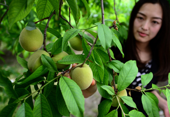 | 隴南市武都區(qū),一名科技人員正在查看“水果村”里的水果長(zhǎng)勢(shì) |