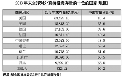 雖然我國(guó)對(duì)外投資增速迅猛,但從投資存量來看,與發(fā)達(dá)國(guó)家仍有較大差距。報(bào)告指出,2013年末,中國(guó)對(duì)外直接投資存量6604億美元,位列全球第11位,但其存量規(guī)模僅為同期美國(guó)的10.4%,英國(guó)的35%,德國(guó)的38.6%,法國(guó)的40.3%,日本的66.5%。