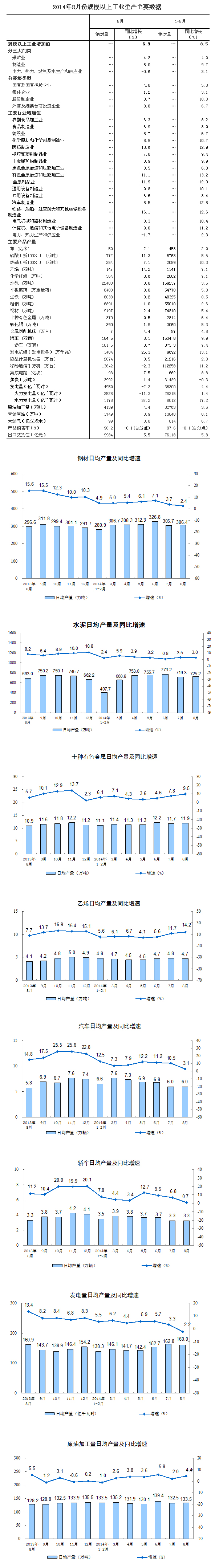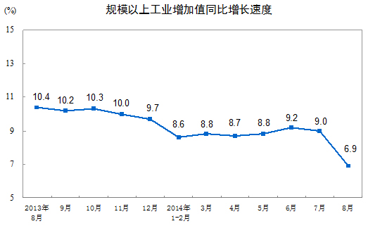 2014年8月份,規(guī)模以上工業(yè)增加值同比實(shí)際增長6.9%(以下增加值增速均為扣除價(jià)格因素的實(shí)際增長率),比7月份回落