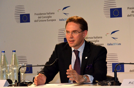 9月13日,在意大利米蘭,歐盟委員會負(fù)責(zé)經(jīng)濟(jì)與貨幣事務(wù)委員卡泰寧出席新聞發(fā)布會。 當(dāng)日,歐盟輪值主席國意大利的經(jīng)濟(jì)部長帕多安在米蘭歐盟財(cái)政部長非正式會議結(jié)束時(shí)說,促進(jìn)歐洲經(jīng)濟(jì)增長需要更多投資,尤其需要私人投資以及發(fā)揮催化劑作用的公共投資,為此需要?jiǎng)?chuàng)造盈利條件,特別是通過結(jié)構(gòu)性改革為投資解凍。