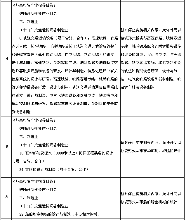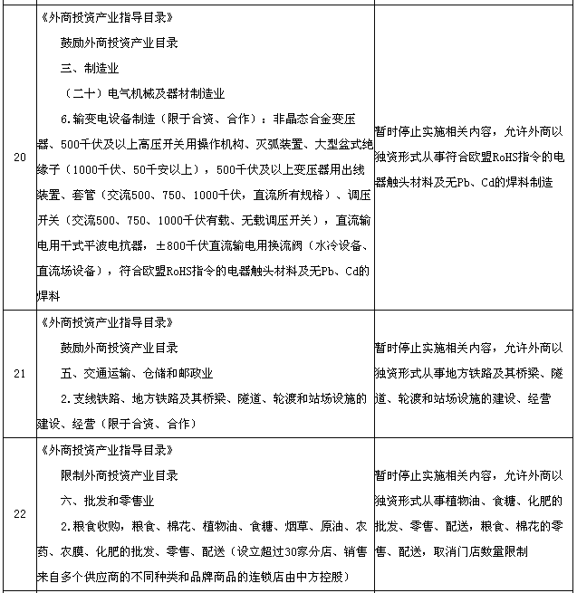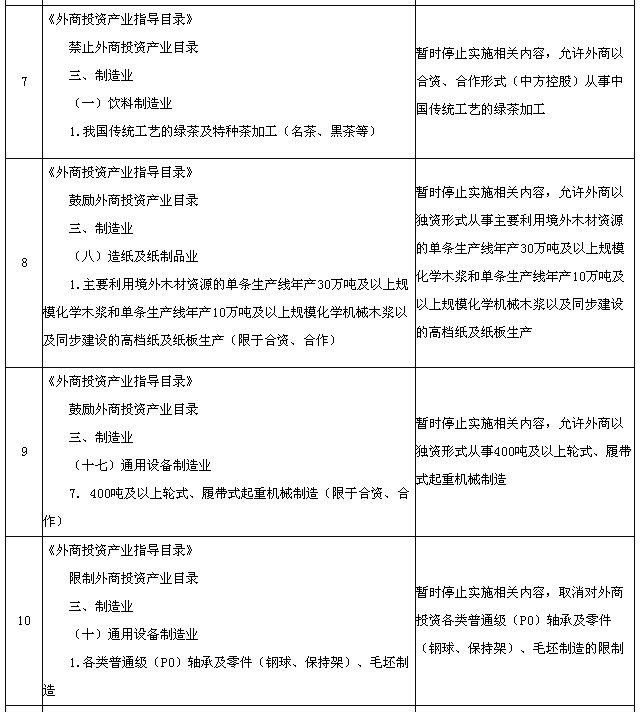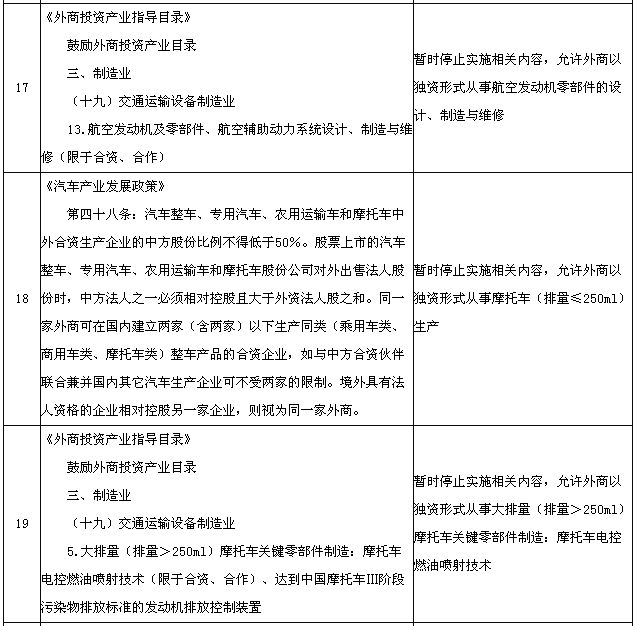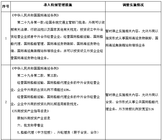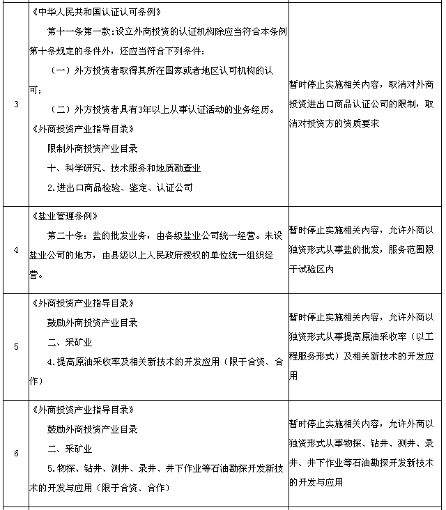 為適應(yīng)在中國(上海)自由貿(mào)易試驗區(qū)進一步擴大開放的需要,國務(wù)院決定在試驗區(qū)內(nèi)暫時調(diào)整實施《中華人民共和國國際海運條例》、《中華人民共和國認(rèn)證認(rèn)可條例》、《鹽業(yè)管理條例》以及《外商投資產(chǎn)業(yè)指導(dǎo)目錄》、《汽車產(chǎn)業(yè)發(fā)展政策》、《外商投資民用航空業(yè)規(guī)定》規(guī)定的有關(guān)資質(zhì)要求、股比限制、經(jīng)營范圍等準(zhǔn)入特別管理措施(目錄附后)。