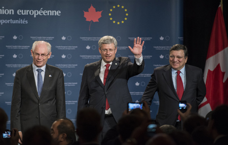 加拿大和歐盟日前于多倫多簽署雙邊自由貿(mào)易協(xié)定。預(yù)計(jì)該協(xié)定將使雙邊貿(mào)易額增加20%。圖為歐洲理事會(huì)主席范龍佩、加拿大總理哈珀和歐盟委員會(huì)主席巴羅佐(從左至右)在簽署協(xié)議后出席招待會(huì)。