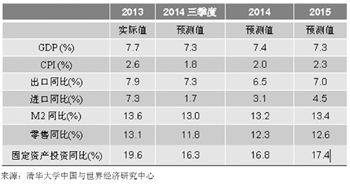 這一表態(tài)和最近幾天一些智庫機構(gòu)的預(yù)測較為接近。清華大學(xué)中國與世界經(jīng)濟研究中心公布的四季度報告稱:2014年二季度經(jīng)濟增長速度的回升并沒有延續(xù)到第三季度。7月以來,拉動GDP增長的三駕馬車中投資和消費的增長速度相對今年上半年和全年同期都有所下降,與之相對的,外需有所恢復(fù)帶來了出口的整體回升,為中國經(jīng)濟維持比較快的增長速度提供了一定支持。根據(jù)模型預(yù)測,2014年GDP全年增速7.4%。