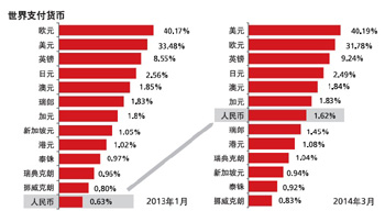 環(huán)球同業(yè)銀行金融電訊協(xié)會(SWIFT)數(shù)據(jù)顯示,人民幣繼美國之后在2013年12月取代了歐元,成為全球貿(mào)易金融中使用率第二高的貨幣。另外,人民幣已經(jīng)躍升為第七大國際支付貨幣。星展銀行經(jīng)濟(jì)學(xué)家周洪禮表示,隨著境外普及率的不斷提高,人民幣國際化機(jī)制正逐漸成形。盡管人民幣并未達(dá)到基本可兌換的地位,但很多國家的央行已經(jīng)開始將人民幣納入該國的官方外幣資金。