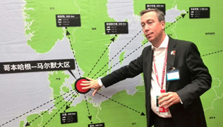 由瑞典、丹麥兩國組成的哥本哈根-馬爾默大區(qū)商務(wù)代表團(tuán)14日在深圳推介營商環(huán)境,招徠中國企業(yè)前往投資。位于大區(qū)中的哥本哈根-馬爾默港是本次推介活動的重點項目。憑借輻射歐洲的戰(zhàn)略位置、優(yōu)越的物流交通樞紐地位,以及潛力巨大的工業(yè)園區(qū),這個綜合性綠色港口希望與中國企業(yè)深度合作,實現(xiàn)“雙贏”。圖為哥本哈根-馬爾默港總裁約翰·瑞斯汀介紹港口環(huán)境。