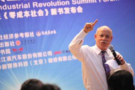 美國著名趨勢學(xué)家杰里米·里夫金16日在本報和中信出版社聯(lián)合主辦的“2014第三次工業(yè)革命高峰論壇”上表示,中國應(yīng)加快向“零邊際成本社會”推進,這會使中國一直到2050年持續(xù)保持繁榮。本次論壇獲安徽江淮汽車股份有限公司支持。