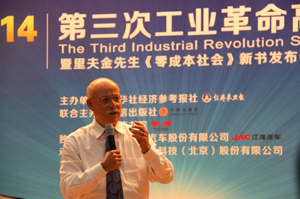 美國著名趨勢學(xué)家里夫金在“2014第三次工業(yè)革命高峰論壇”上演講。王皓然/攝 |