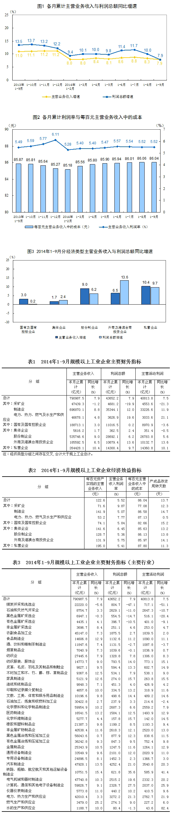 1-9月份,規(guī)模以上工業(yè)企業(yè)主營(yíng)業(yè)務(wù)收入利潤(rùn)率為5.52%,每百元主營(yíng)業(yè)務(wù)收入中的成本為86.04元,每百元資產(chǎn)實(shí)現(xiàn)的主營(yíng)業(yè)務(wù)收入為122.6元,產(chǎn)成品存貨周轉(zhuǎn)天數(shù)為13.7天。
