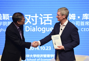 10月23日,蒂姆·庫克接受清華經(jīng)管學(xué)院贈(zèng)送的紀(jì)念品。記者 戚恒