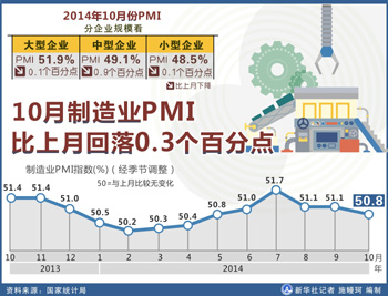 中國物流與采購聯(lián)合會、國家統(tǒng)計局服務(wù)業(yè)調(diào)查中心11月1日發(fā)布的數(shù)據(jù)顯示,2014年10月中國制造業(yè)采購經(jīng)理指數(shù)(PMI)為50.8%,較上月回落0.3個百分點,為5個月新低。多方分析認(rèn)為,PMI未能如預(yù)期回升,預(yù)示著當(dāng)前市場內(nèi)生動力仍弱。受益于近期陸續(xù)出臺的調(diào)控政策,四季度經(jīng)濟(jì)增長可能基本保持平穩(wěn),但隨著政策效力消退,明年中國經(jīng)濟(jì)將面臨更嚴(yán)峻考驗。