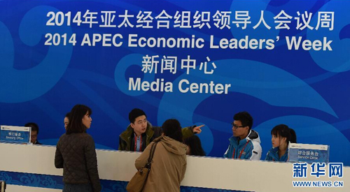 11月4日,國(guó)家會(huì)議中心新聞中心綜合服務(wù)臺(tái)的工作人員在提供咨詢服務(wù)。當(dāng)日,2014年亞太經(jīng)合組織(APEC)領(lǐng)導(dǎo)人會(huì)議周兩個(gè)新聞中心之一的國(guó)家會(huì)議中心新聞中心正式啟用向媒體記者開放。據(jù)介紹,新聞中心總面積約11000平方米,全面覆蓋免費(fèi)無(wú)線網(wǎng)絡(luò),將為媒體提供視頻、文字、圖片綜合素材和專業(yè)的廣播電視服務(wù)。新華社記者