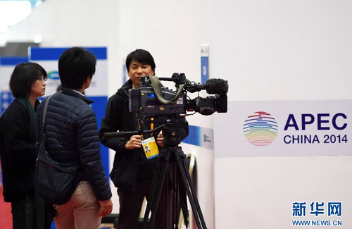 11月4日,國家會(huì)議中心新聞中心綜合服務(wù)臺的工作人員在提供咨詢服務(wù)。當(dāng)日,2014年亞太經(jīng)合組織(APEC)領(lǐng)導(dǎo)人會(huì)議周兩個(gè)新聞中心之一的國家會(huì)議中心新聞中心正式啟用向媒體記者開放。據(jù)介紹,新聞中心總面積約11000平方米,全面覆蓋免費(fèi)無線網(wǎng)絡(luò),將為媒體提供視頻、文字、圖片綜合素材和專業(yè)的廣播電視服務(wù)。新華社記者 陳曄華/攝