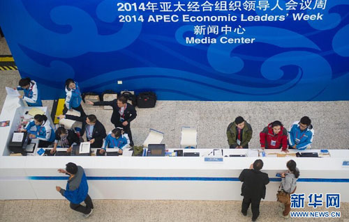 11月4日,國(guó)家會(huì)議中心新聞中心綜合服務(wù)臺(tái)的工作人員在提供咨詢服務(wù)。當(dāng)日,2014年亞太經(jīng)合組織(APEC)領(lǐng)導(dǎo)人會(huì)議周兩個(gè)新聞中心之一的國(guó)家會(huì)議中心新聞中心正式啟用向媒體記者開放。據(jù)介紹,新聞中心總面積約11000平方米,全面覆蓋免費(fèi)無(wú)線網(wǎng)絡(luò),將為媒體提供視頻、文字、圖片綜合素材和專業(yè)的廣播電視服務(wù)。新華社記者 陳曄華/攝
