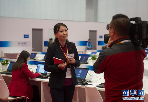 11月4日,國家會議中心新聞中心綜合服務臺的工作人員在提供咨詢服務。當日,2014年亞太經(jīng)合組織(APEC)領(lǐng)導人會議周兩個新聞中心之一的國家會議中心新聞中心正式啟用向媒體記者開放。據(jù)介紹,新聞中心總面積約11000平方米,全面覆蓋免費無線網(wǎng)絡(luò),將為媒體提供視頻、文字、圖片綜合素材和專業(yè)的廣播電視服務。新華社記者 陳曄華/攝