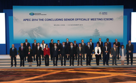 11月5日,2014年亞太經(jīng)合組織(APEC)最后一次高官會在北京國家會議中心舉行,拉開了今年APEC領導人會議周大幕。這是出席會議的高級官員合影。