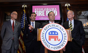 5日,在美國(guó)首都華盛頓,共和黨全國(guó)委員會(huì)主席賴因斯·普里伯斯(右二)在新聞發(fā)布會(huì)上講話!