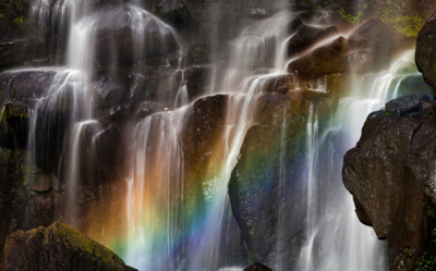 七彩飛瀑處在蜀南竹海石鼓山和石鑼山之間的葫蘆谷中,從深林里流出的水潦河,在回龍橋下分為四級瀉下懸崖,落差近200米,蔚為壯觀。晴天正午,日光下徹,可見彩虹生于潭底。站于其頭上,下為懸崖峭壁,只能聞其聲而不能睹其貌,故名“飛聲瀑”!∫渍婷鳌z