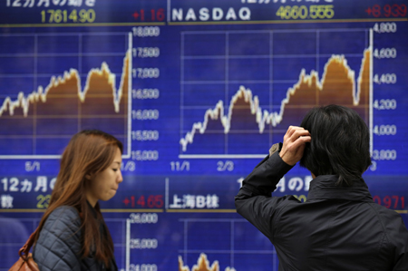 11月12日,在日本東京,人們?cè)谧C券公司的股票行情電子板前關(guān)注股票行情。 受市場(chǎng)普遍預(yù)期日本首相安倍晉三可能暫緩進(jìn)一步上調(diào)消費(fèi)稅刺激,12日東京股市高開高走,日經(jīng)225種股票平均價(jià)格指數(shù)在收盤時(shí)比前一個(gè)交易日上漲0.43%,創(chuàng)7年來新高。