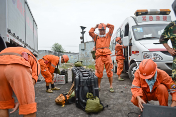 礦山救護隊隊員在進行下井救援前的準備工作(8月19日攝)! ⌒氯A社記者