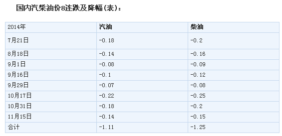 國(guó)家發(fā)展改革委14日發(fā)出通知,決定將汽、柴油價(jià)格每噸分別降低190元和180元,測(cè)算到零售價(jià)格90號(hào)汽油和0號(hào)柴油(全國(guó)平均)每升分別降低0.14元和0.15元,調(diào)價(jià)執(zhí)行時(shí)間為11月14日24時(shí)。