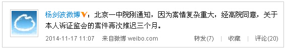 11月17日,楊劍波發(fā)布微博稱(chēng),“北京一中院剛通知,因?yàn)榘盖閺?fù)雜重大,經(jīng)高院同意,關(guān)于本人訴證監(jiān)會(huì)的案件再次推遲三個(gè)月。”據(jù)知,這已經(jīng)是北京一中院第三次下達(dá)延期宣判的通知。