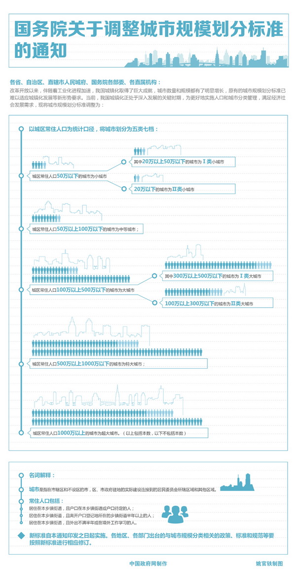 國務院通知指出,各地區(qū)、各部門出臺的與城市規(guī)模分類相關的政策、標準和規(guī)范等要按照新標準進行相應修訂。