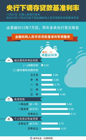 央行近日宣布,自2014年11月22日起下調(diào)金融機構人民幣貸款和存款基準利率。金融機構一年期貸款基準利率下調(diào)0.4個百分點至5.6%;一年期存款基準利率下調(diào)0.25個百分點至2.75%。與此同時,央行宣布,結合推進利率市場化改革,將金融機構存款利率浮動區(qū)間的上限由存款基準利率的1.1倍調(diào)整為1.2倍。