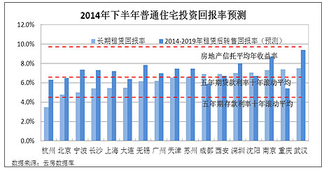 “高回報高風(fēng)險是投資市場基本特征”,當(dāng)房產(chǎn)投資回報率高于房地產(chǎn)信托和上市公司收益率時,意味著投資決策時應(yīng)謹(jǐn)慎應(yīng)對。據(jù)上圖,上述各城市住宅投資回報率均小于房地產(chǎn)信托平均年收益率,風(fēng)險相對合理。