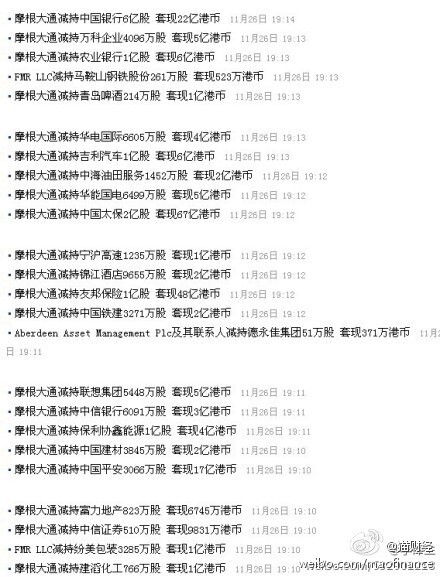 港交所最新數(shù)據(jù)顯示,摩根大通于11月20日全方位減持中國銀行、農(nóng)業(yè)銀行、友邦保險、中國鐵建等70余只港股,涉及領(lǐng)域包括銀行、保險、券商、地產(chǎn)、建材、鋼鐵、能源、消費(fèi)等。