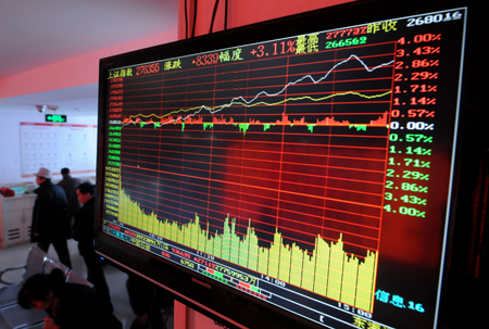 圖為,在河南洛陽一家證券營業(yè)廳內(nèi)拍攝的當(dāng)日滬指漲幅K線圖。