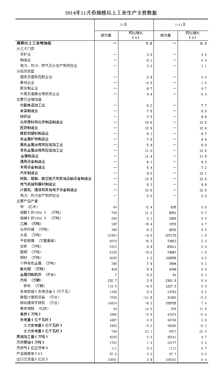 2014年11月份,規(guī)模以上工業(yè)增加值同比實際增長7.2%(以下增加值增速均為扣除價格因素的實際增長率),比10月份回落0.5個百分點。從環(huán)比看,11月份比上月增長0.52%。1-11月份,規(guī)模以上工業(yè)增加值同比增長8.3%。
