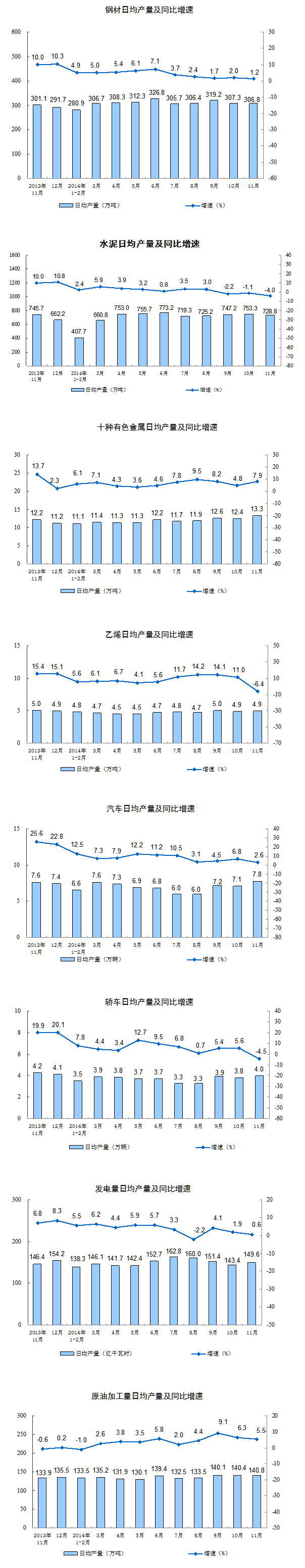 分產(chǎn)品看,11月份,鋼材9205萬噸,同比增長1.2%;水泥21863萬噸,下降4.0%;十種有色金屬398萬噸,增長7.9%;乙烯147萬噸,下降6.4%;汽車232.7萬輛,增長2.6%;轎車118.5萬輛,下降4.5%;發(fā)電量4487億千瓦時,增長0.6%;原油加工量4225萬噸,增長5.5%。