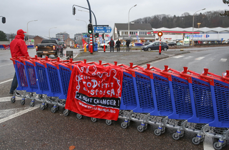 圖為當(dāng)日在比利時(shí)讓布,一名男子經(jīng)過一條由超市手推車構(gòu)建的路障。