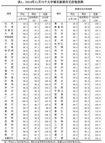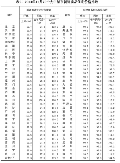 統(tǒng)計局網(wǎng)站18日公布2014年11月份70個大中城市住宅銷售價格變動情況。