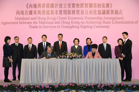 12月18日,《關(guān)于內(nèi)地在廣東與香港基本實(shí)現(xiàn)服務(wù)貿(mào)易自由化的協(xié)議》在港簽署,《協(xié)議》即日生效并在2015年3月1日實(shí)施。商務(wù)部表示,《協(xié)議》簽署后,內(nèi)地將在廣東率先與香港基本實(shí)現(xiàn)服務(wù)貿(mào)易自由化,同時(shí)為內(nèi)地全境與香港基本實(shí)現(xiàn)服務(wù)貿(mào)易自由化先行先試積累經(jīng)驗(yàn)。此間特區(qū)政府及工商界人士認(rèn)為,《協(xié)議》為內(nèi)地對(duì)香港開(kāi)放市場(chǎng)帶來(lái)突破性的發(fā)展,有利于進(jìn)一步推進(jìn)兩地經(jīng)濟(jì)融合。