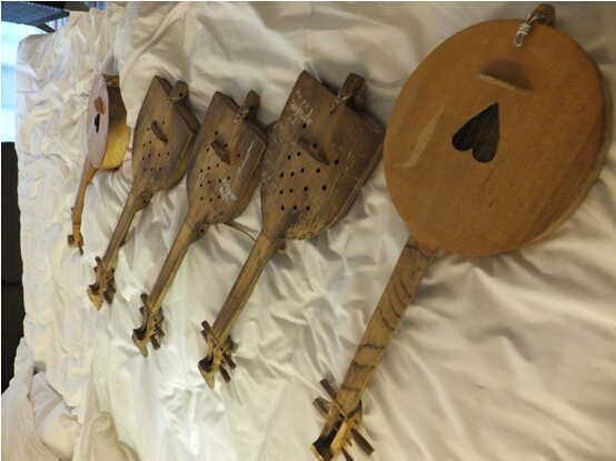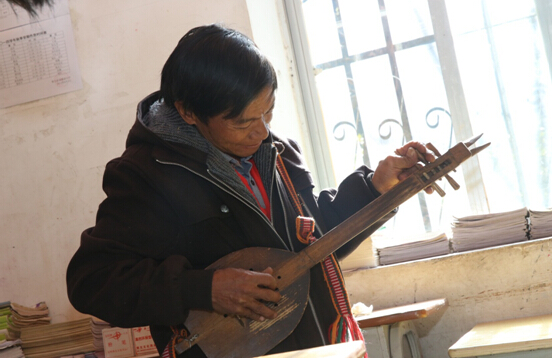 黝黑的膚色,一身灰藍(lán)色的棉布衣,帶著一頂具有民族特色的繡制帽子,身材略顯矮小但很結(jié)實(shí)的和盛偉透露出一種特別的“堅(jiān)韌”感。他在談起自己與四弦琴的特別緣分時(shí),很自然地拿出了自己的《殘疾證》,然后輕松地笑笑說(shuō):“我從小身體不方便,在十幾歲時(shí)開(kāi)始拿起了四弦琴,跟著我爸爸學(xué)了起來(lái),這讓我多了很多快樂(lè),也感覺(jué)有了很多希望!