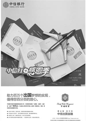也許您喜歡徜徉在塞納河畔看著夕陽余暉,品味法國的浪漫;也許您期待坐著小艇穿梭在水城威尼斯,感受意大利文藝復(fù)興的展現(xiàn)的精致;又或許作為鐵桿球迷的您最希望坐在伯納烏球場,親自為心愛的球隊搖旗吶喊。隨著經(jīng)濟發(fā)展和人們文化素質(zhì)的提高,國內(nèi)游已經(jīng)不能滿足我國居民的旅行需求,F(xiàn)在,越來越多的人期待走出國門“看一看”、“充充電”,但復(fù)雜的出國手續(xù)和陌生的國外生活讓許多人望而卻步!耙鰢,找中信”,越來越多的客戶通過中信銀行的出國金融服務(wù),輕松完成了出國夢。據(jù)介紹,中信銀行出國金融服務(wù)具備以下四大專業(yè)優(yōu)勢:可實現(xiàn)全球ATM取現(xiàn),取款零時差;信用卡主(附)卡的境外消費即時動態(tài)反饋;學(xué)費電匯業(yè)務(wù)可智能交易記錄,再次回款無需填表;房產(chǎn)抵押綜合授信申請留學(xué)貸款,一次抵押多次支用,資金運用更靈活。就是憑借這些專業(yè)而優(yōu)質(zhì)的服務(wù),中信銀行讓客戶“走出國門”的愿望變得更加簡單易行。據(jù)了解,中信銀行在今年四季度的“中信紅·感恩季,愛在感恩有禮”零售業(yè)務(wù)綜合營銷活動中,將出國金融作為特色產(chǎn)品,配備了系列優(yōu)惠活動,感恩回饋客戶,提升客戶滿意度。