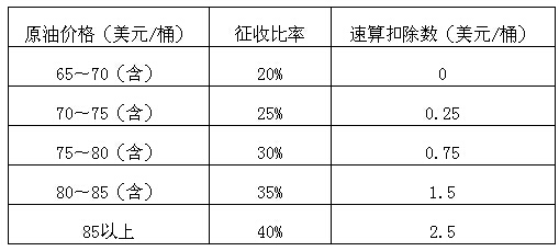 經(jīng)國務(wù)院批準(zhǔn),財政部決定從2015年1月1日起,將石油特別收益金起征點提高至65美元/桶。起征點提高后,石油特別收益金征收仍實行5級超額累進從價定率計征。具體征收比率及速算扣除數(shù)見下表: