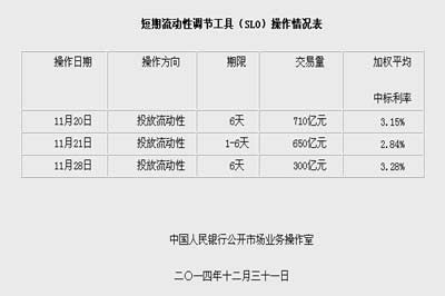 央行今日公告,2014年11月份,人民銀行以利率招標(biāo)方式開(kāi)展了短期流動(dòng)性調(diào)節(jié)工具(SLO)操作。具體情況如下: