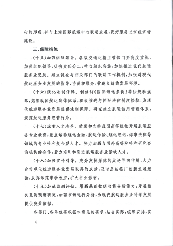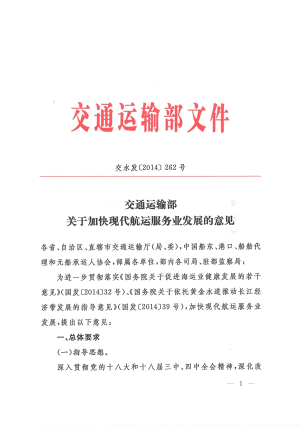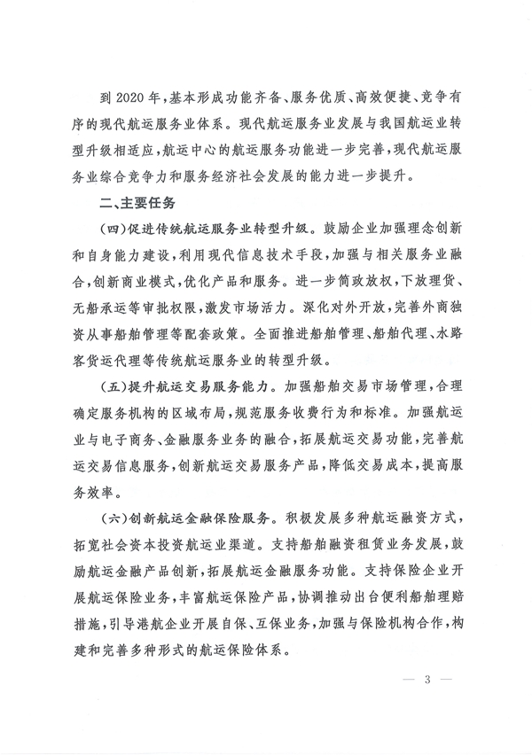 今日交通部正式發(fā)布《關(guān)于加快現(xiàn)代航運(yùn)服務(wù)業(yè)發(fā)展的意見》(后簡(jiǎn)稱“《意見》”),稱2020年我國(guó)將基本形成功能齊備、服務(wù)優(yōu)質(zhì)、高效便捷、競(jìng)爭(zhēng)有序的現(xiàn)代航運(yùn)服務(wù)業(yè)體系。