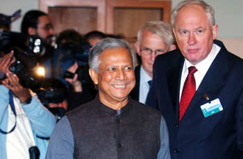 “實(shí)際上,我想踐行這樣一種機(jī)制,就是讓那些有能力的窮人得到這筆錢,通過(guò)某種方式,給他們貸款來(lái)幫助他們。而這樣的一種機(jī)制應(yīng)該說(shuō)是‘放之四海而皆準(zhǔn)’的,無(wú)論是在孟加拉,在中國(guó),在危地馬拉,還是在美國(guó)等等,都一樣!痹L談結(jié)束時(shí),尤努斯這樣告訴記者。
