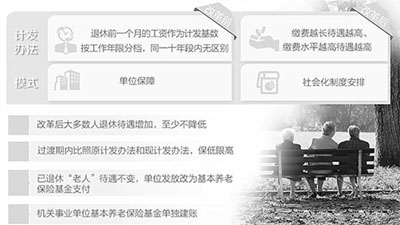 胡曉義介紹說,就個(gè)人而言,此次改革主要有兩方面的變化。其一,改變了制度模式。原來的制度模式是單位保障,即單位自己管自己的退休人員,F(xiàn)在則變成一種社會(huì)化的制度安排,每個(gè)單位不管人多人少,都按照同樣標(biāo)準(zhǔn)繳費(fèi),然后形成一個(gè)基金用于支付退休人員待遇。這樣,單位退休撫養(yǎng)比不平衡的狀況就被分散掉了,成為社會(huì)化的養(yǎng)老保險(xiǎn)制度。
