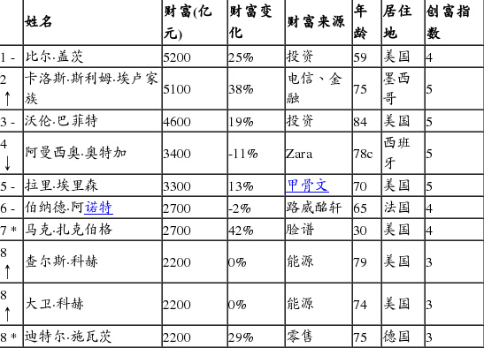 59歲的蓋茨財(cái)富5200億元,蟬聯(lián)世界首富;斯利姆財(cái)富5100億元緊隨其后;巴菲特財(cái)富4600億元位列第三。前三位財(cái)富增長(zhǎng)總和達(dá)到3000億元,平均每分鐘增長(zhǎng)60萬(wàn)元。
