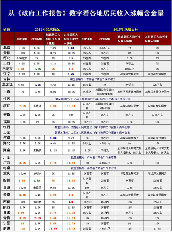 (表中數(shù)據(jù)來源于各省份2015年《政府工作報告》。其中,紅色數(shù)字為該項目最高值;藍(lán)色數(shù)字為該項最低值;綠色為CPI第二低;橙色數(shù)字表示該省份全年GDP增幅超過2014年全國GDP預(yù)期目標(biāo)的7.5%,且收入增幅雙雙超過GDP增幅)