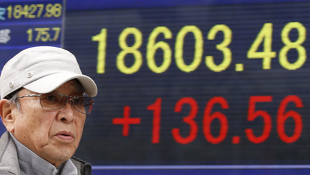 2月24日,一名男子經(jīng)過日本東京街頭的股指顯示牌。 受日元持續(xù)小幅貶值等積極因素提振,24日東京股市連續(xù)第五個(gè)交易日收高,日經(jīng)225種股票平均價(jià)格指數(shù)在收盤時(shí)比前一交易日上漲0.74%,再次刷新近15年最高紀(jì)錄。